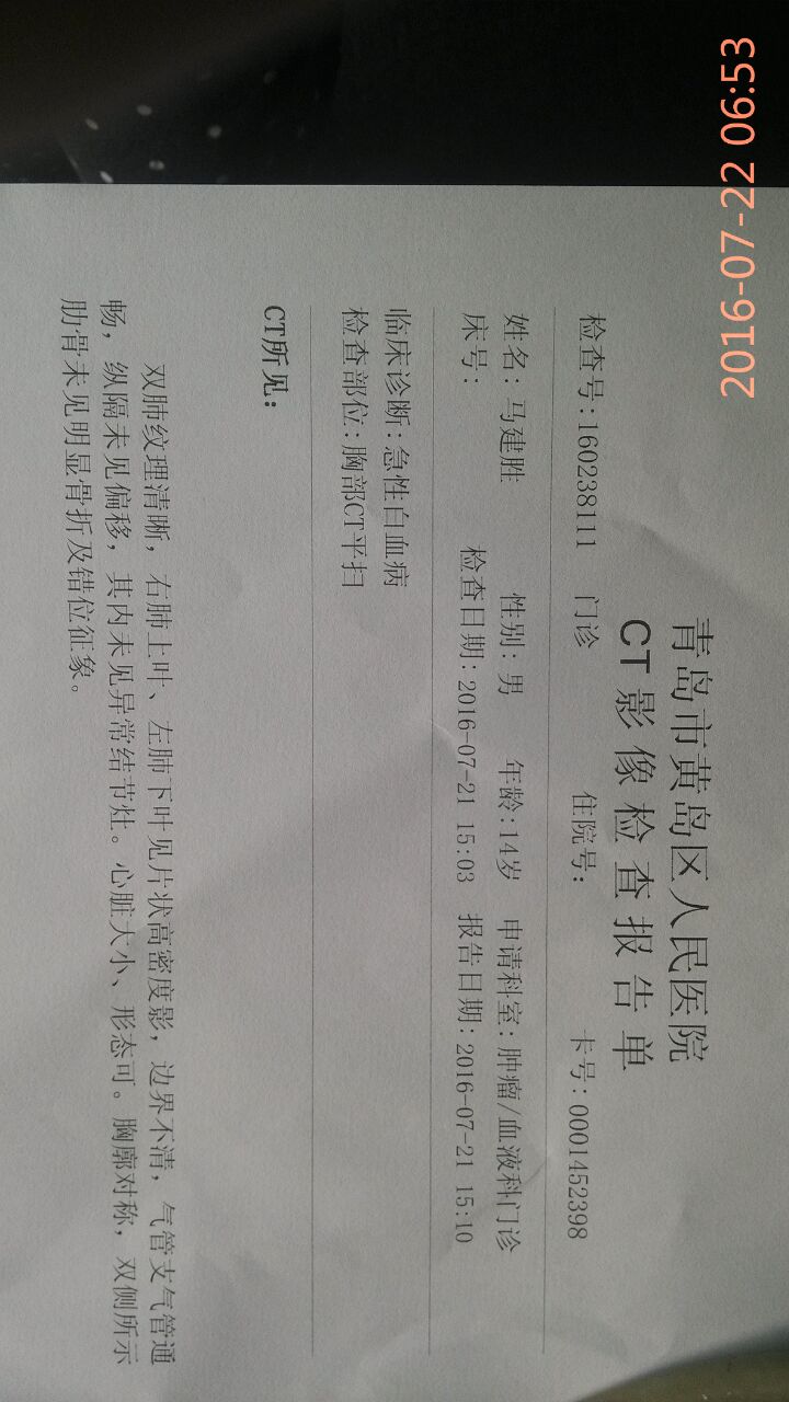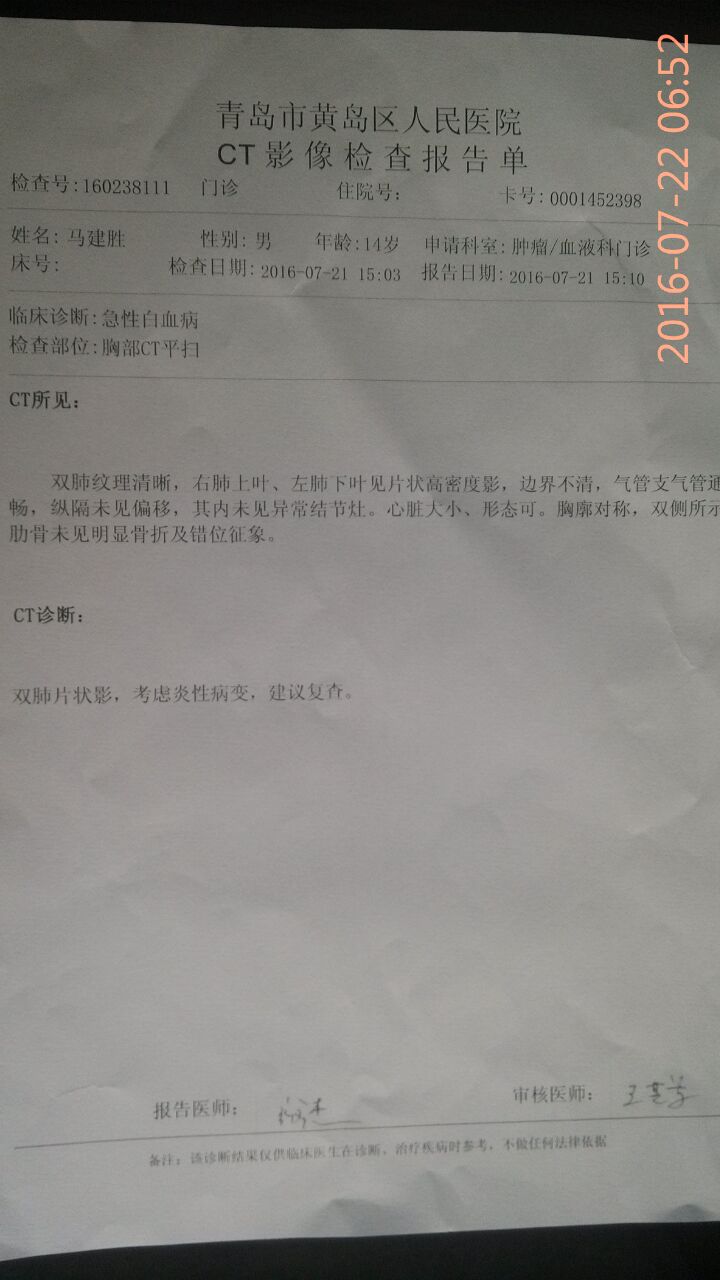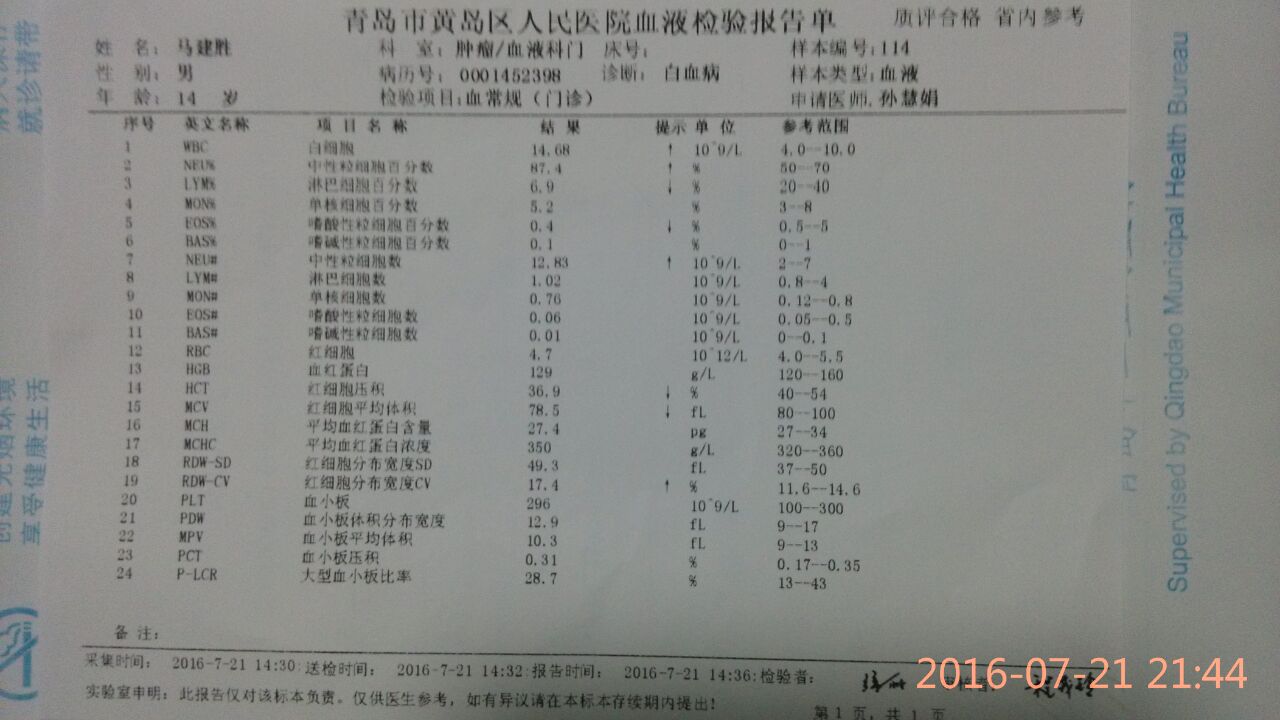 吴老师听了这对夫妇的叙说,看了孩子身体的状况,并做了舌头诊断,孩子的舌苔上有的地方脱苔,有的地方苔厚,属于阴阳双虚的舌诊结果。测量了三遍孩子的血压后,初步判断是孩子身上有燥火,应该给孩子喝绿豆水疏泄祛火,但一摸孩子的手心和身上都感觉发凉,孩子还存在心阳严重不足的问题。为了稳妥起见,吴老师暂时先不给孩子喝绿豆水,并建议王馆长立刻带孩子到黄岛区人民医院做六项检查。在检查期间,王馆长又打电话叫人送一床薄被子送到医院,他发现孩子特别怕冷,原来是送孩子来青岛的路上,车子一路上都开空调。吴老师也与王馆长随时保持电话联系,每一项检查的结果出来后,她立刻做出相应的分析和判断。在之前从网络传过来的医院检查单子看,孩子的主要问题是:血小板较高,胆红素较高,淋巴细胞偏低。